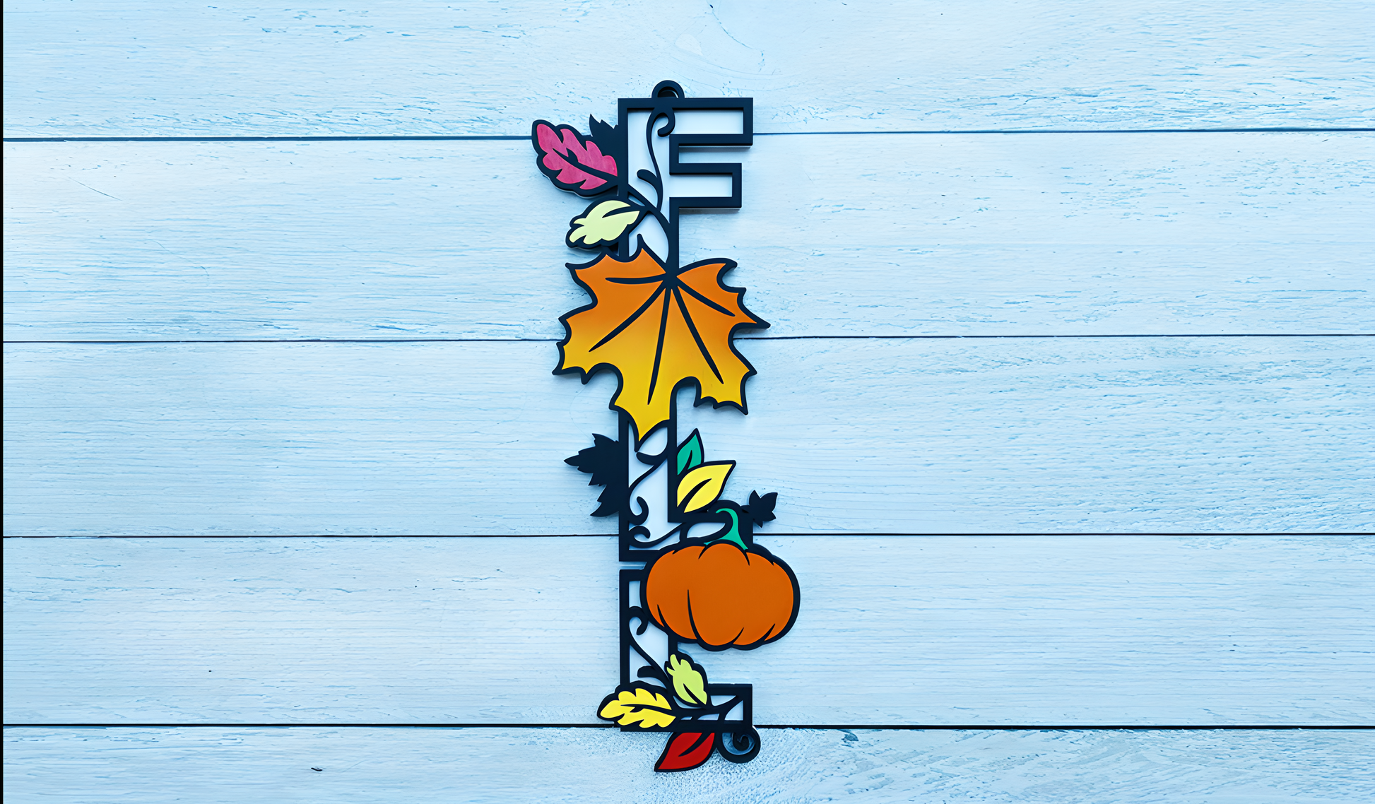 Celebrate the cozy season with this handcrafted Fall Monogram Wall Decor. Featuring a bold “F” adorned with vibrant autumn leaves and a charming pumpkin accent, this piece brings instant seasonal warmth to your home. Perfect for hanging on your front door, in your entryway, or as part of your fall décor display. Dimension : 7x18