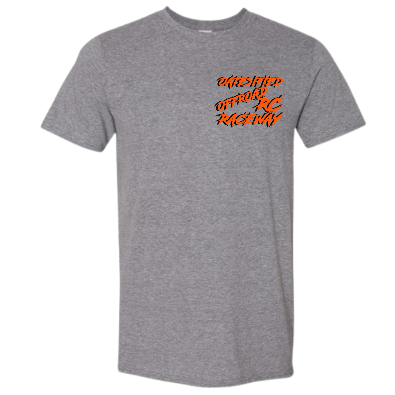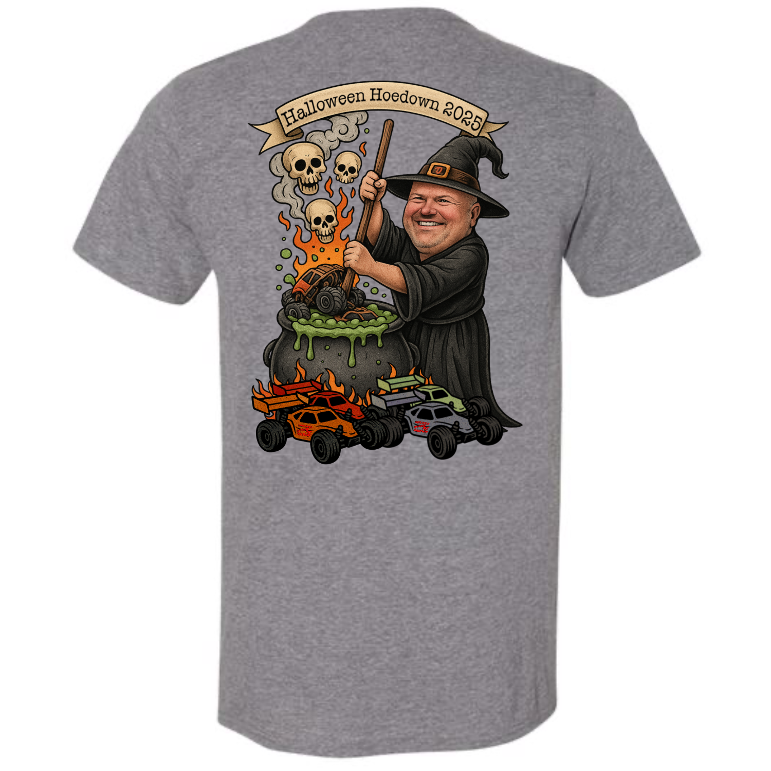 Short Sleeve Heather Grey T-Shirt with the Oatesified Logo on the front and the Inaugural 2025 Halloween Hoedown design on the back.